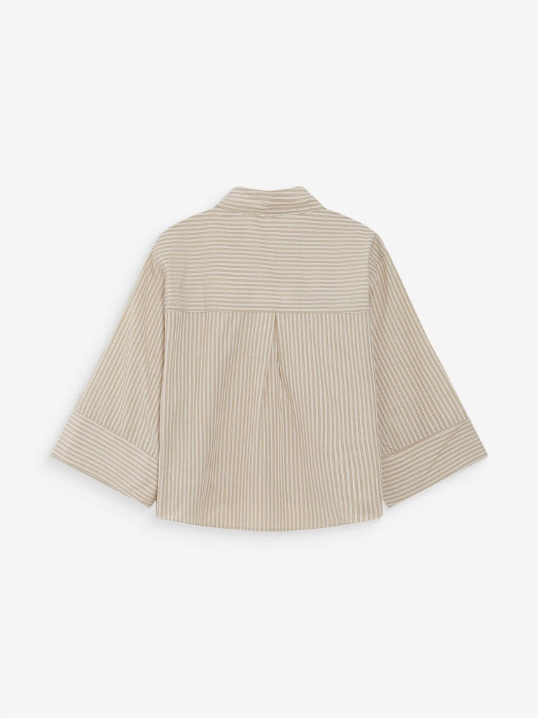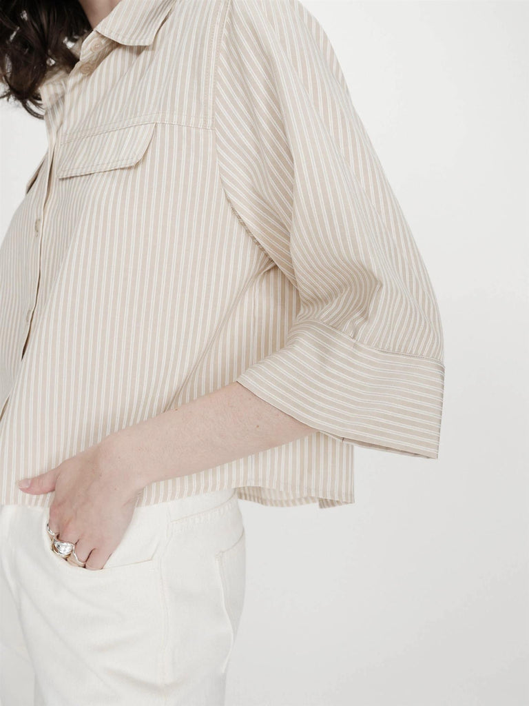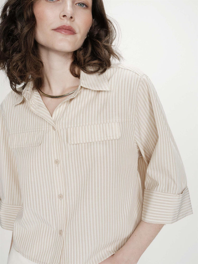 The VOICE striped shirt features a short, straight cut. The 3/4 sleeves end with wide cuffs. The classic shirt collar and the flap pockets on the chest offer a modern reinterpretation of the traditional work shirt. The vertical stripes visually elongate the silhouette. The front button fastening on the VOICE cropped shirt as well as the back pleat subtly structure the silhouette.
