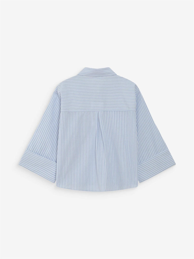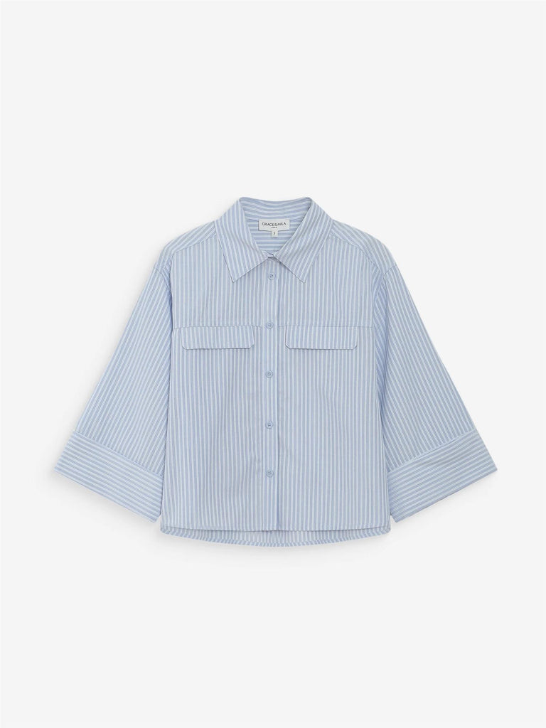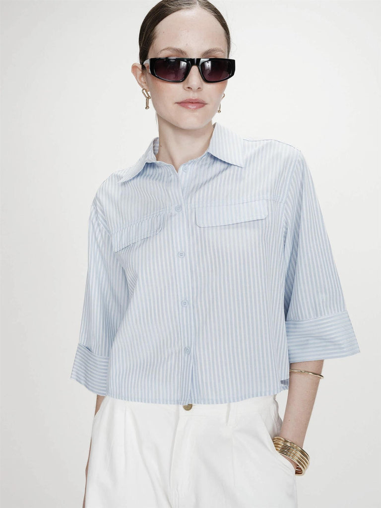 The VOICE striped shirt features a short, straight cut. The 3/4 sleeves end with wide cuffs. The classic shirt collar and the flap pockets on the chest offer a modern reinterpretation of the traditional work shirt. The vertical stripes visually elongate the silhouette. The front button fastening on the VOICE cropped shirt as well as the back pleat subtly structure the silhouette.