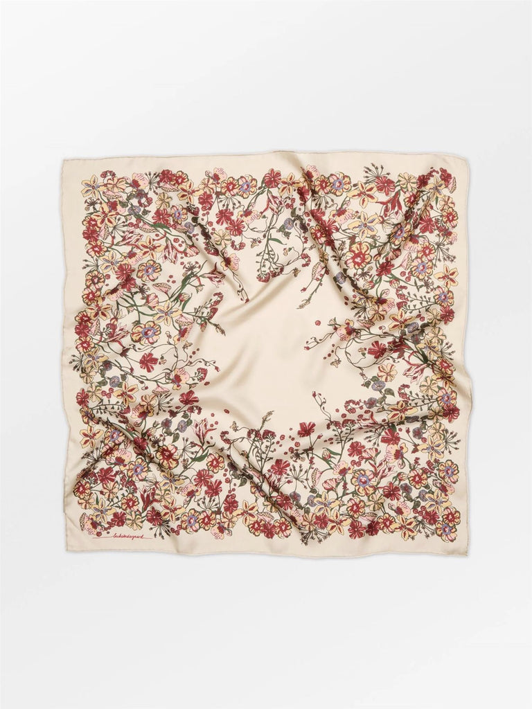 Floralia Sia Scarf from Becksöndergaard is a square scarf measuring 65 x 65 cm, made from 100% silk. The floral pattern creates a light, feminine look, while the silk feels soft against the skin. Wear it around your neck, in your hair or tied to your bag to add a little extra to your outfit.