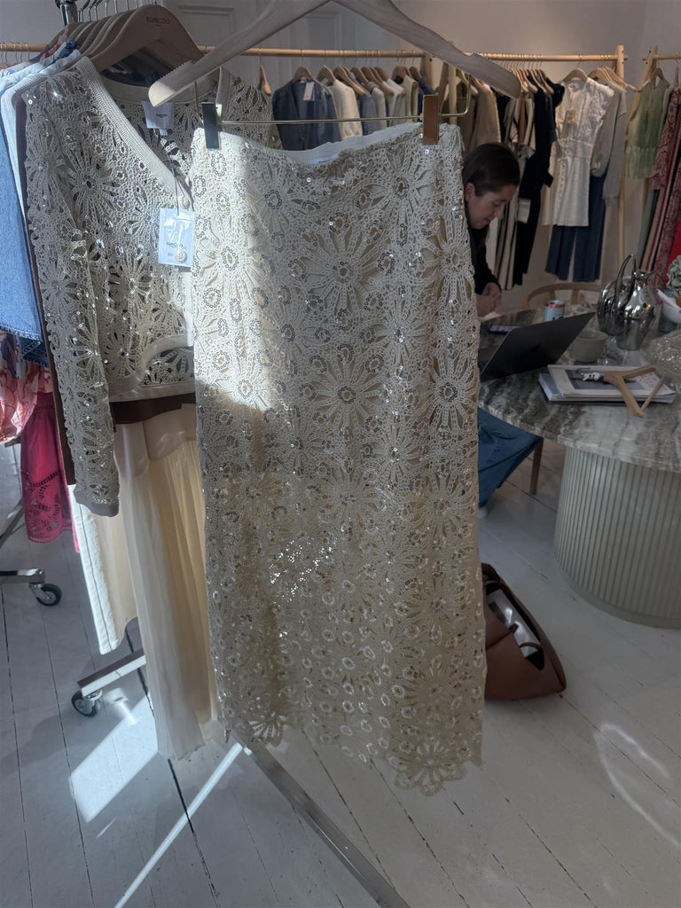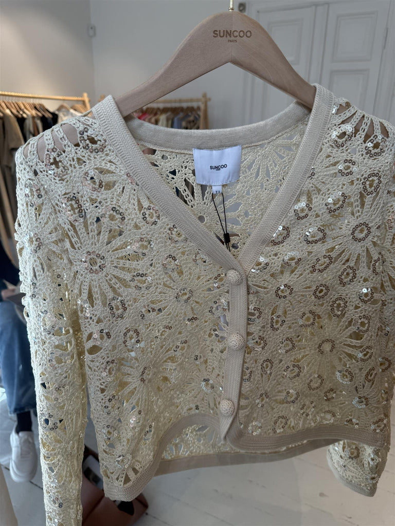 En helt nydelig car5digan jakke i et helt nydelig blondestoff med paljettdetaljer.